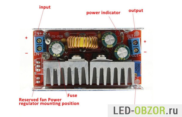 Мой лабораторный блок питания работает от блока ноутбука на 19V 90W, но этого не хватает для проверки последовательно подключенных светодиодов. Последовательная LED цепочка требует от 30В до 50В. Покупать готовый блок на 50-60 Вольт и 150W оказалось дороговато, около 2000 руб. Поэтому заказал первый повышающий стабилизатор за 500 руб. с повышением до 50В. После проверки оказалось, что он максимум до 32В, потому что на входе и выходе стоят конденсаторы на 35V. Убедительно написал продавцу своё возмущение, и через пару дней мне вернули денежку.