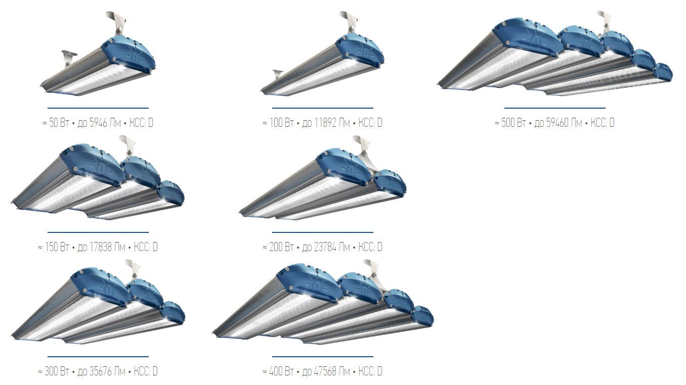 Модельный ряд состоит из 7 базовых модификаций, которые отличаются мощностью, световым потоком и размерами. Цветовая температура 4000К и 5000К. Дневному нейтральному белому свету соответствует значение 5000К, у ламп накаливания теплый свет на 2700К-2900К.