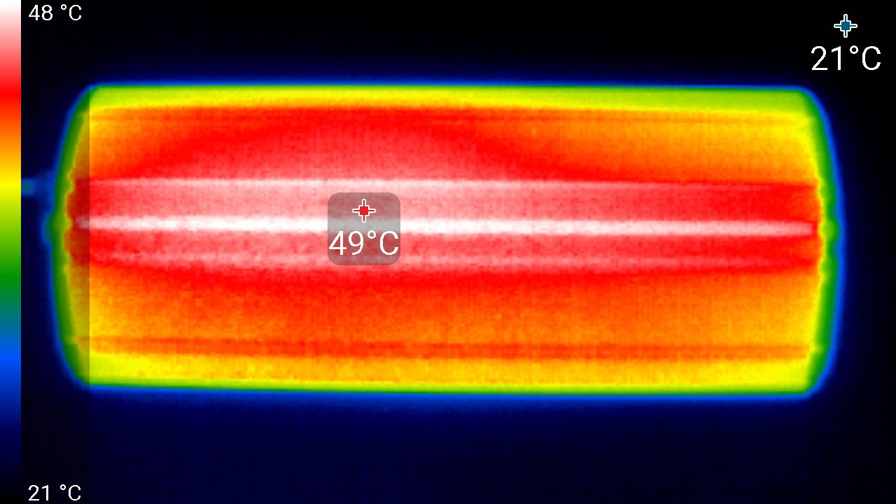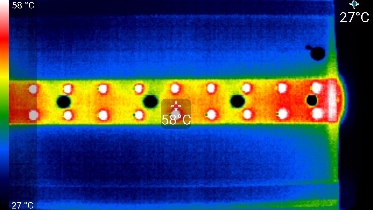 В течение 60 минут образец прогревается при температуре воздуха в лаборатории 22 градуса. Для получения объективных результатов по нагреву светодиодов и корпуса также использовались прибор с термопарой и инфракрасные пирометры.