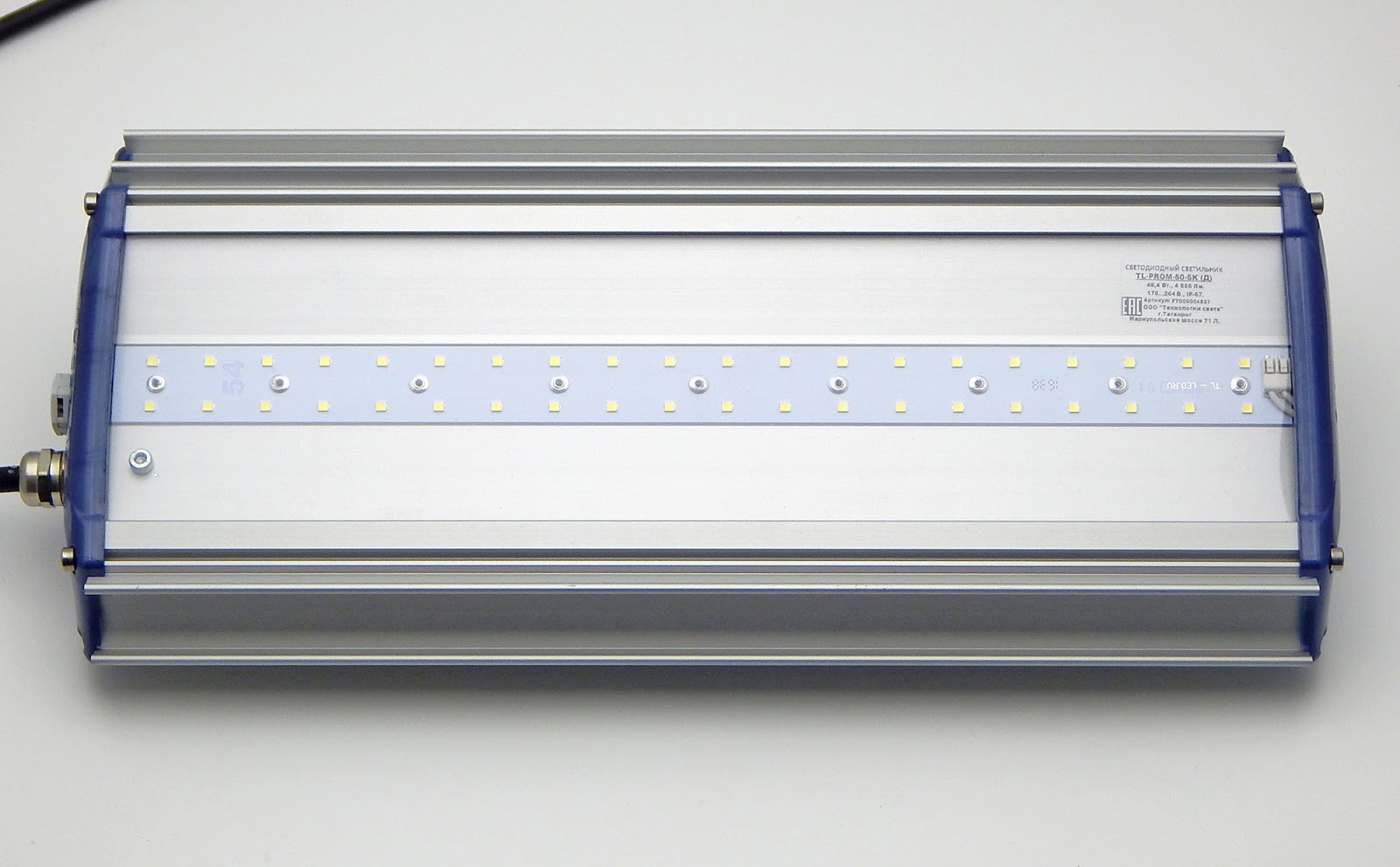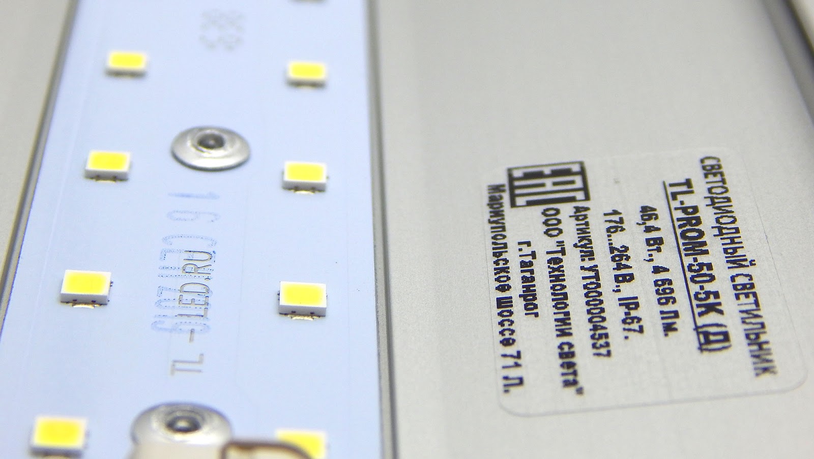 Полное наименование светодиодного промышленного светильника TL-PROM-50-5K (Д), что соответствует мощности 50W и цветовой температуре 5000К. Корпус выполнен из анодированного алюминия, защита от влажности IP67. Использованы фирменные светодиоды Osram DURIS S5 GW PSLT33.PM с оптимальным соотношением характеристик и качества.