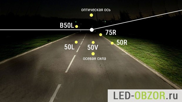 Для сравнения разных источников света существует ГОСТ Р 41.112-2005 в котором регламентирования условия проведения замеров. Световое пятно у каждого источника разное, например ксенон и LED, поэтому используются конкретные и наиболее важные точки. Их наглядно изобразил на фото дороги с места водителя.