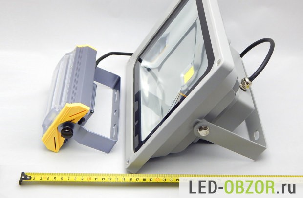 По сравнению с миниатюрным светодиодным прожектором от Наносвета на 40W, образец от ИЕК выглядит внушительно и промышленно. Большинство неопытных читателей скажут, что большой будет светить гораздо лучше, чем его соперник.