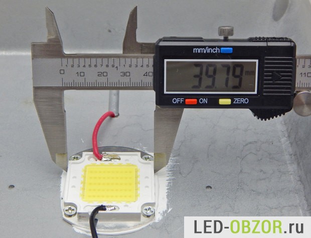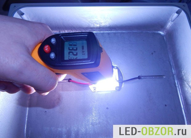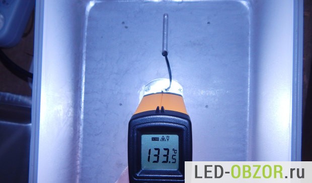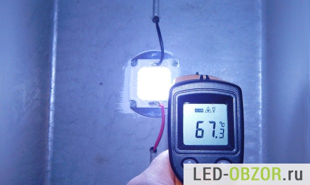 Полученные результаты показывают, что у пятидесятиватника большие проблемы с теплоотводом. Разница между радиатором и чипом 66°, то есть почти в 2 раза. Кристаллы греются еще сильнее, примерно на 5° — 10° больше. Для недорогих современных элементов температура кристалла может быть до 110°, например у Samsung, LG, Hoglitornic. А тут мы видим приличный перегрев кристаллов, что сильно снижает уменьшает период работы. От перегрева не спасает даже большая система охлаждения, производитель COB чипа на 50W сильно сэкономил на отводе тепла.