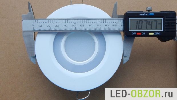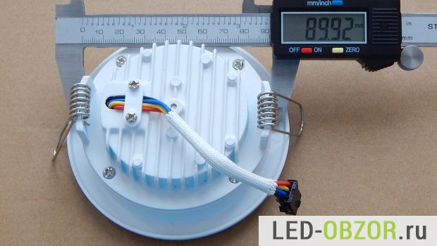 Габариты достаточно малы, хорошо впишется на кухню или кладовку. Для установки в ванную комнату требуется соответствующий уровень защиты от влаги, которого здесь нет. Наружный диаметр 107,5мм, отверстие для установки минимум 90мм. Ребра на задней стороне корпуса слишком малы для функции отвода тепла, и придают жесткости конструкции.