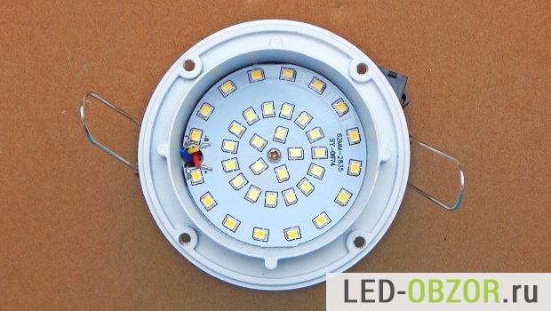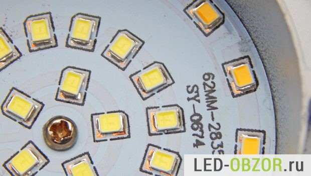 Не дне литого корпуса расположен алюминиевый диск со светодиодами SMD 2835 на 0,2W, белых в центре 20 штук и 16 желтых по краю. На фото видно, что они отличаются светом люминофора. Чем его больше, чем желтее и теплее свет.