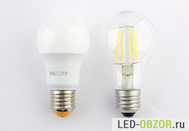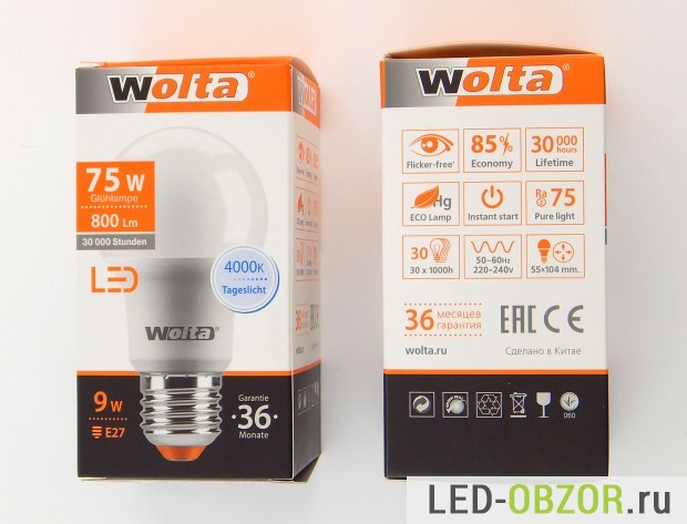 В обзоре участвую светодиодные лампы Е27 Wolta с диаметром 55мм. Полное обозначение образцов Wolta 25S55BL9E27.