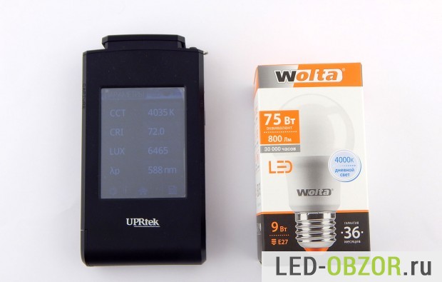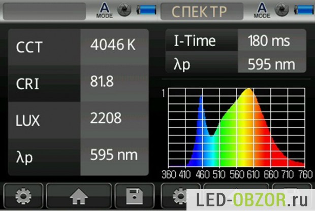 Индекс цветопередачи и цветовую температуру измеряем портативным спектрометром UPRtek MK350. Цветопередача имеет значение 82, что делает пригодным для качественного освещения жилых помещений и домов.