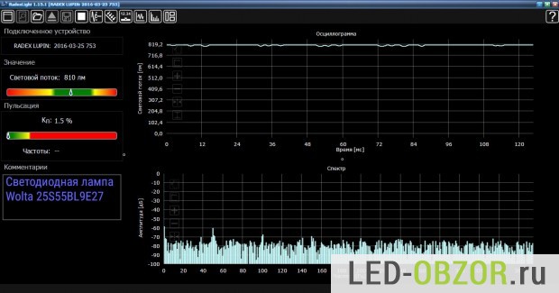 Световой поток измеряется в фотометрическом шаре после прогрева ламп. Получилось 810 люмен при обещанных 800лм, отличный результат. Обычно 95% имеют этот показатель ниже заявленного. Пульсации светового потока полностью отсутствуют, получилось 1,5%. С учётом погрешности самого прибора, показатель равен нулю.