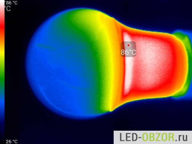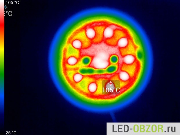 Прогретый образец обследуем тепловизором с высоким разрешением 240х320 точек. Корпус современных ламп с цоколем Е27 может нагреваться до 100° и это нормально. Нагрев корпуса не является признаком плохого качества, как думают некоторые. Светодиоды средней ценовой категории по характеристикам имеют допустимый нагрев до 110°, при этом сохраняется заявленный срок службы и другие характеристики.