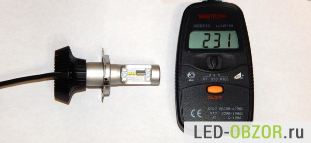 Замеры проводил в проверенном измерительном кубе. Показания люксметра делим на коэффициент 2,16 и получаем люмены. Люксметр в диапазоне Х10, то есть к циферкам на экране добавляем нолик в конце.