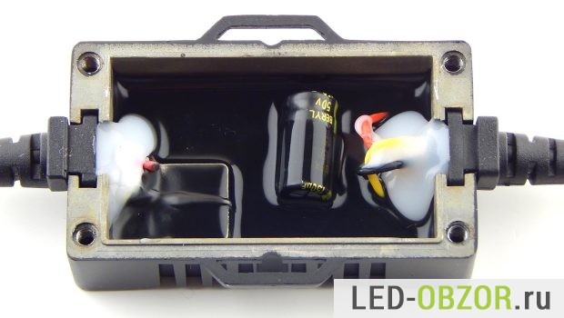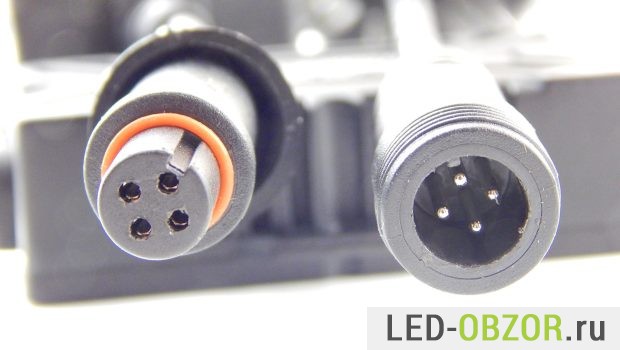 Для соединение источника питания и авто лампочки используется коннектор на 4 контакта, который сверху герметично закрывается колпачком на резьбе.