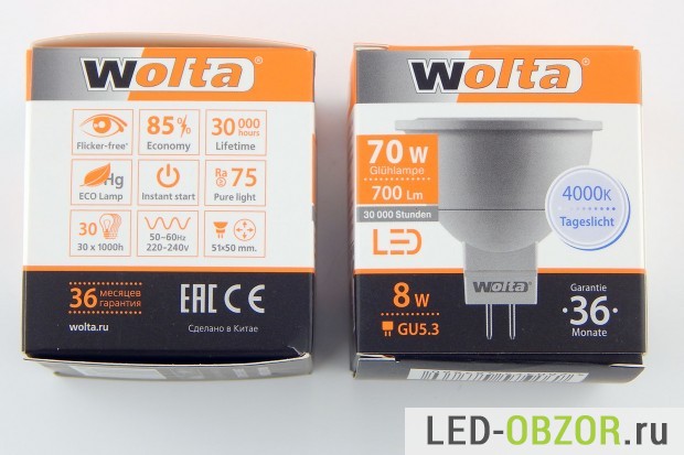 Мощность образца довольно высокая 8 Ватт, система охлаждения должна иметь хорошую эффективность. Полная маркировка образцов Wolta 25SMR15-220-8GU5.3