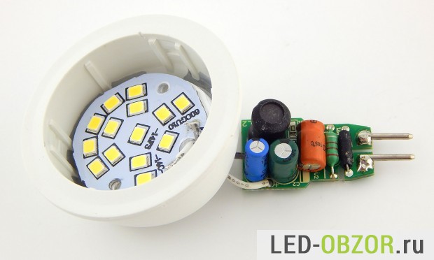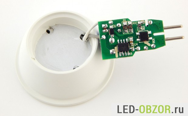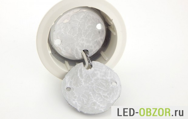 Корпус является системой охлаждения, небольшой алюминиевый стакан покрытый пластиком. Удивило наличие хорошей термопасты, равномерно нанесённой на круглую алюминиевую пластинку со светодиодами. Благодаря этому светодиодная лампа не перегревается, при таких небольших габаритах. Чаще всего термопаста бывает нанесена плохо и имеет жёсткую консистенцию, типа пластилина. В данном случае она правильной густоты, что обеспечивает хороший контакт с радиатором.