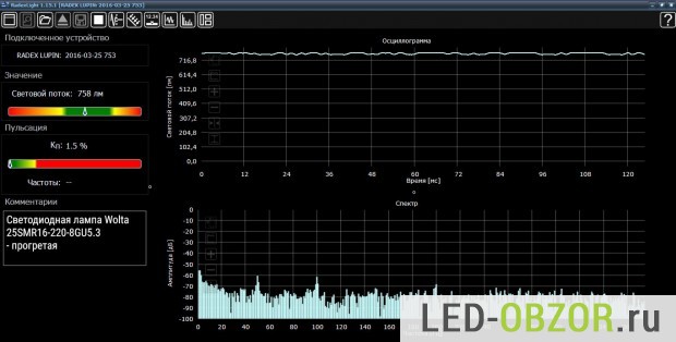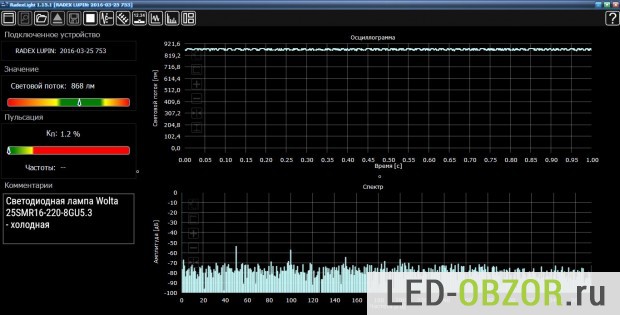 Пульсации света полностью отсутствуют, коэффициент пульсаций 1,5%. У лампы накаливания он в среднем 16%. Значит драйвер качественный и хорошо справляется с нагрузкой.