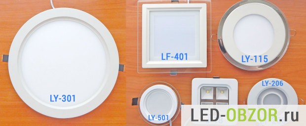 Для написания обзора мне отправили 12 образцов, по 2 штуки каждого вида. Полноценно описать все в одной статье, конечно, не получится. Это будет сводный обзор, и потом каждый образец будет протестирован индивидуально. Ассортимент диодных светильников для натяжных потолков состоит из 6 основных моделей разной мощности, размеров и декора.