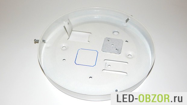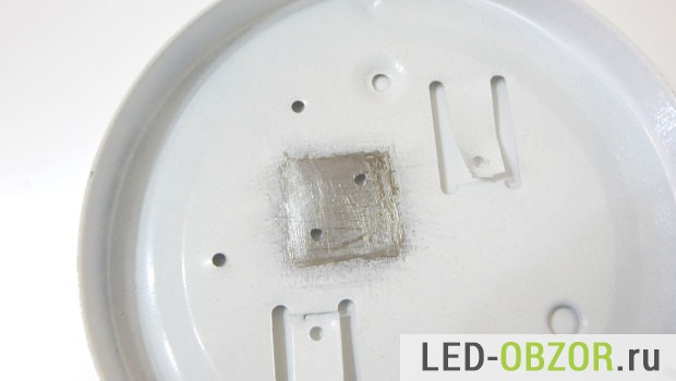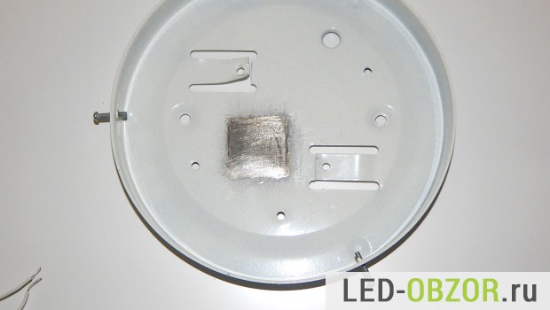 Перед установкой модуля в корпус светильника, необходимо убрать слой краски, для непосредственного контакта с металлом. Обводим пластинку из алюминия и шкурим этот квадрат.