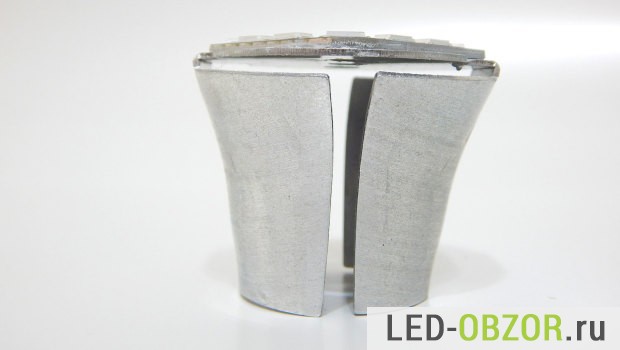 Алюминиевый радиатор можно было одеть на керамический патрон с цоколем E27. Можно расправить из цилиндрической формы в плоскую. Но при разгибании алюминий не выдерживает деформации и начинает ломаться, соответственно теплопроводность в таком узком месте становится еще хуже.