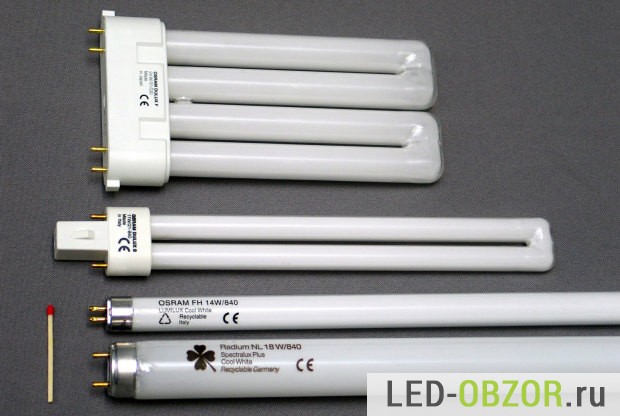 К большим относятся люминесцентные трубки длиной 47см и 120см от потолочных и настенных светильников. Обозначаются T5 и T8, цоколь у них G13, G23. Наиболее популярны на 18 вт и 36 вт