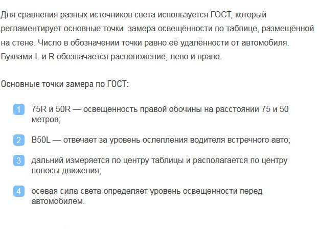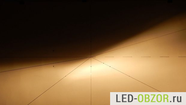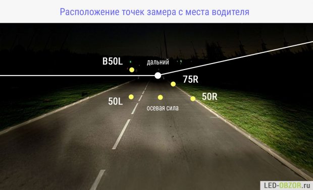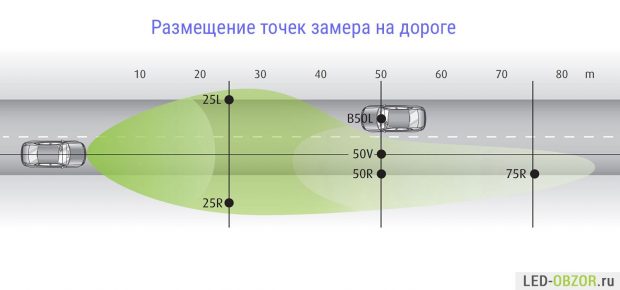 Для теста используем новую фару от Фольксваген Поло с цоколем H4. Замеры проводим люксметром по контрольным точкам предусмотренным ГОСТом, значения в люксах.