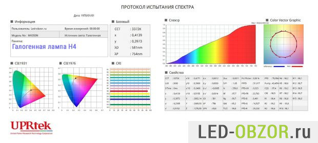 Для измерения используем спектрометр UPRtek MK350. Колбы образцов не имеют монолитного голубого светофильтра, поэтому цветовая температура ближнего и дальнего будeт отличатся.