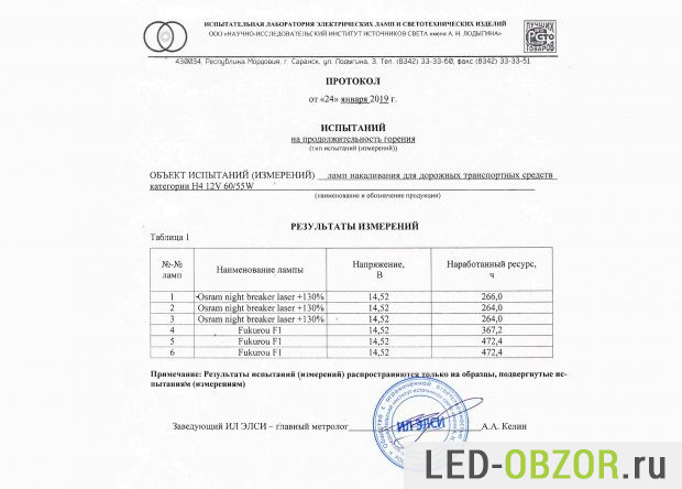 Результаты тестов в сертифицированной лаборатории показывают, что срок службы японских Fukurou F1 почти в 2 раза больше, чем у Осрам, соответственно и Филипса. Фукуро будут светить на 78% дольше, чем ближайшие конкуренты.