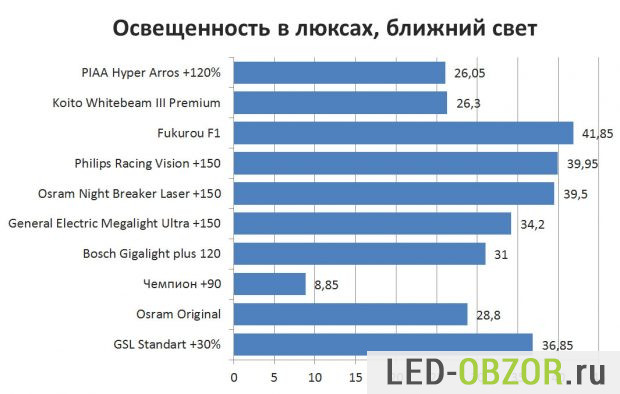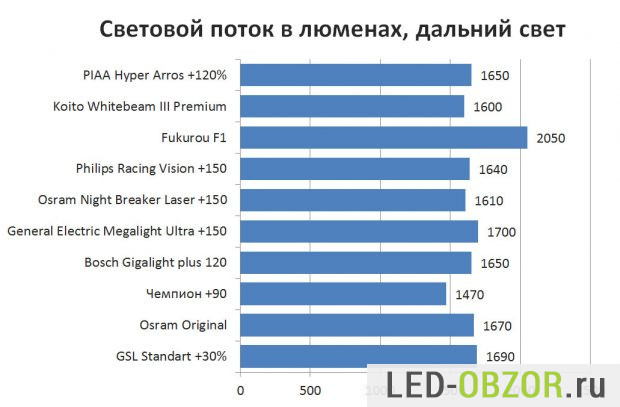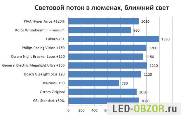 Лучший результат у японских ”Fukurou F1”, выше на 32% по сравнению со штатной Осрам Ориджинал H4, опережают ближайшего конкурента “General Electric Megalight Ultra” на 17%. Хуже всех оказались китайские Чемпион, результат -25%. У остальных моделей световой поток в среднем выше на 10-15% по сравнению со штатной галогенной лампой H4.