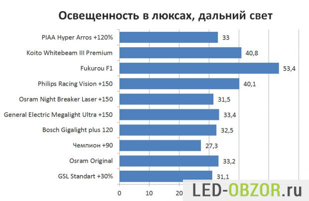 При измерениях в фаре H4 Фольксваген Поло на дальнем свете с большим отрывом побеждают японские Fukurou F1, на дальнем освещенность выше на 30%. В ближнем Fukurou F1 идут наравне с лучшими моделями Филипс и Осрам. Они и становятся лидером в сравнительных тестах.