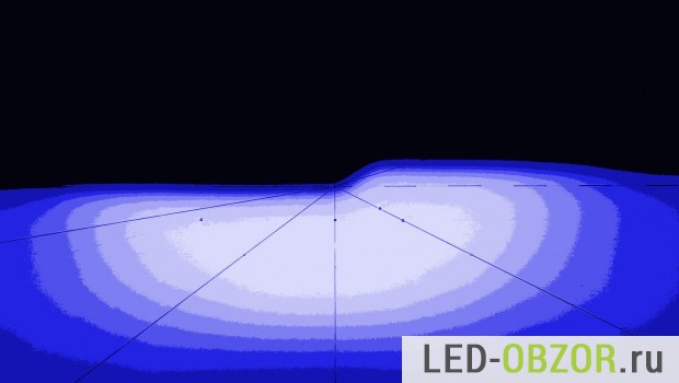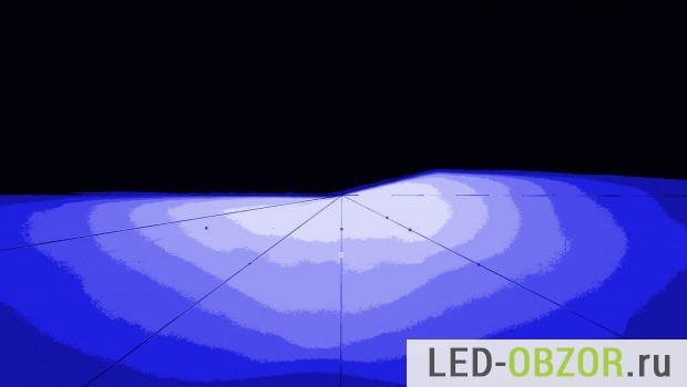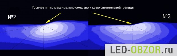Образец №2 имеет очень узкую освещенность с минимальным рассеиванием. Основная часть света ложится только на свою полосу дороги. За счёт разницы в фокусировании , освещенность горячего пятна в 2 раза выше, чем у ксенона. При равноценном расположении горячего пятна у самой светотеневой границы, это даёт эффективность в 2 раза выше на дальней дистанции, где свет уже ложится практически параллельно дорожному полотну.