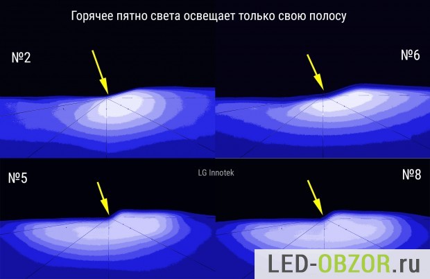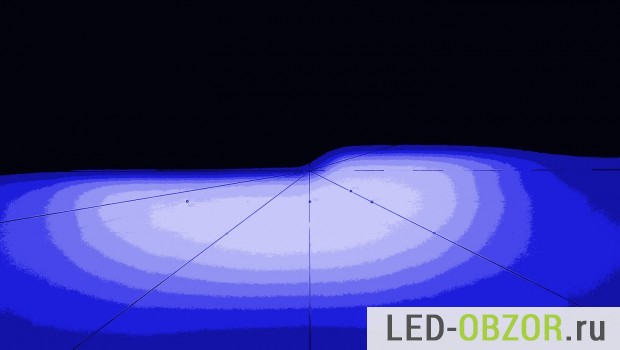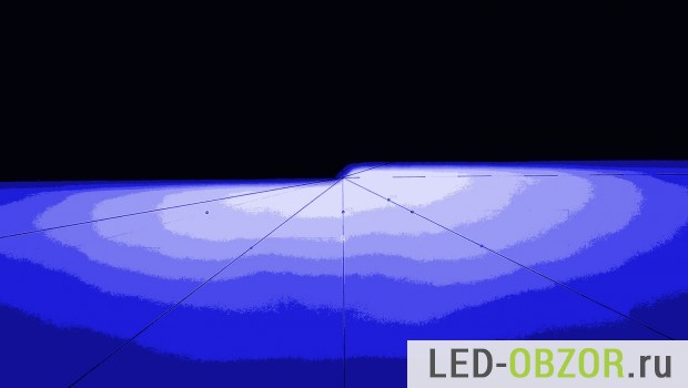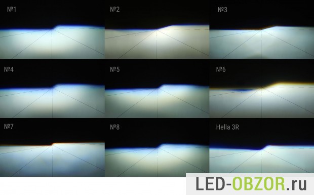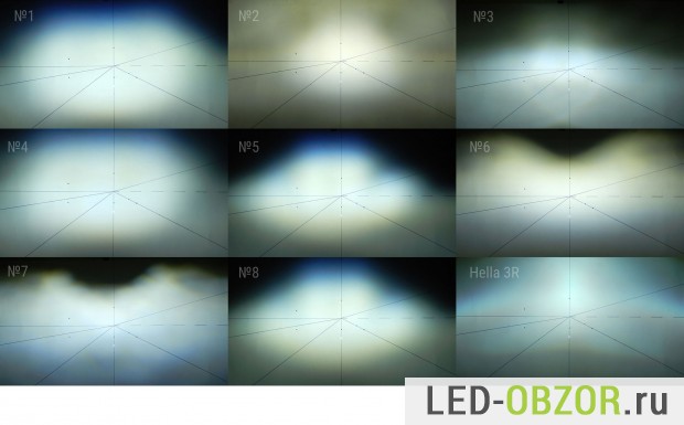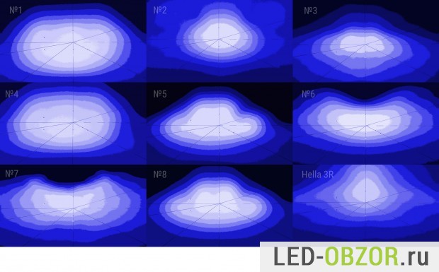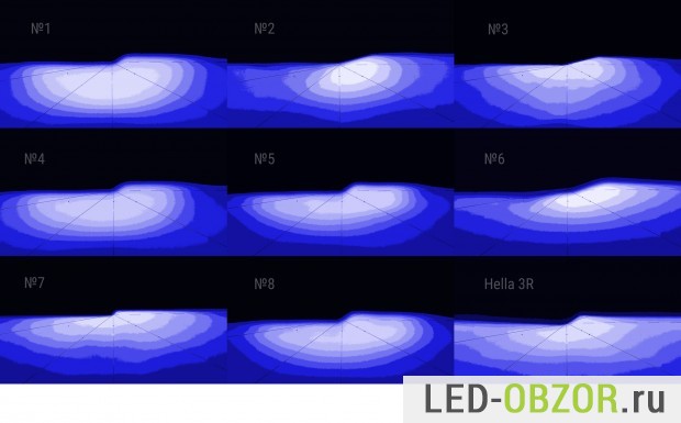 Для наглядного сравнения распределения выберем №1, №2 и №3. У Hella 3R на дальнем проявляется существенный недостаток, она светит выше дороги. У Би Лед линз дальний расположен точно по центру таблицы, а не светит в небо.