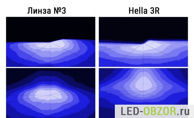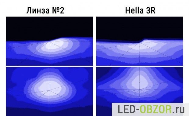 У образца №1 свет собран на дороге с минимальным рассеиванием. У Хеллы размазан по горизонтали, и уходит за пределы обочины. При равном светопотоке эффективность линзы №1 в получается в 2 раза выше, но горячее пятно смещено в ближнюю зону, что сокращает дальность.
