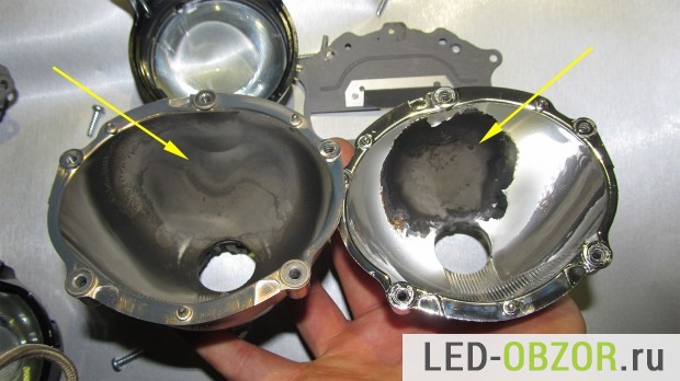 1. Сильный нагрев лампочки до 350°-400° приводит к разрушению отражателя ксеноновой билинзы, фирменные работают в 2 раза дольше китайских. Измерял галогеновые и ксеноновые лампы пирометрами, тепловизором, термопарой. Диапазона измерений хватило только у большого пирометра с максимальным значением замера 400°.