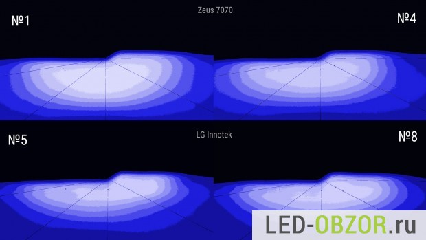 Среди четырёх однотипных моделей №1, №4, №5, №8 сильно выделяется №1, которая светит очень близко. Остальные три имеют схожую освещённость по точкам и среднюю ширину освещения дорожного полотна. Первые две работают на светодиодах Zeus 7070, пятая и восьмая на LG Innotek.