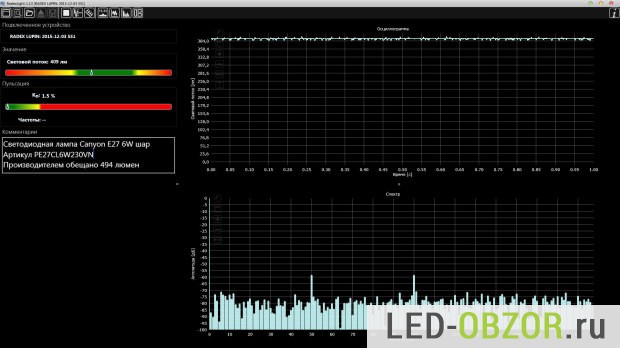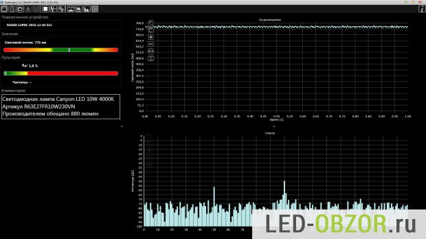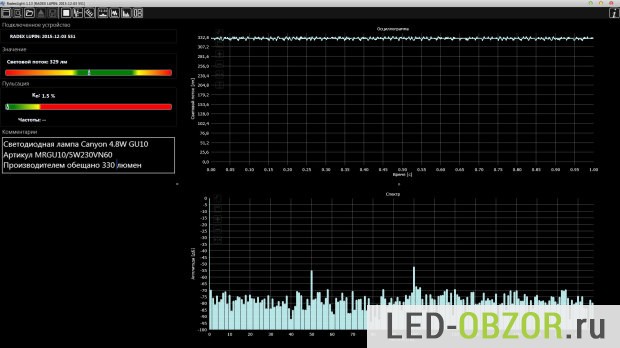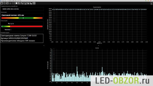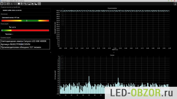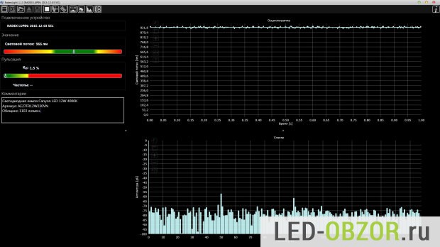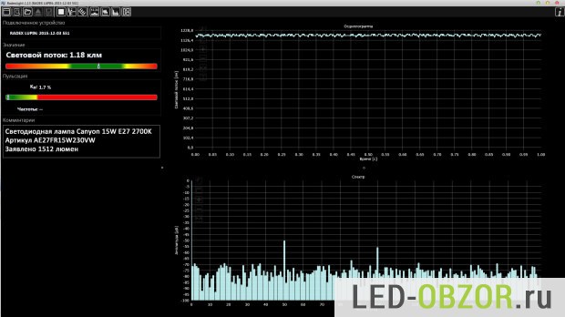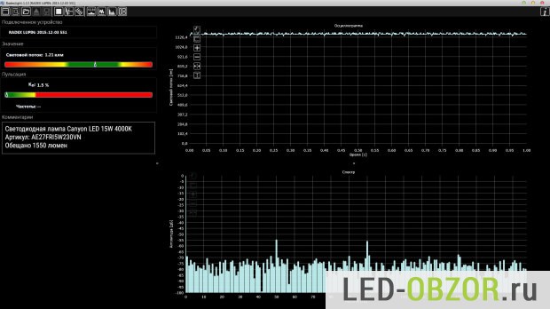 Если источник питания установлен хороший и справляется с нагрузкой, то пульсации должны быть около ноля. На картинках, где указано количество люмен, вы также видите осциллограмму с спектрограмму пульсаций.