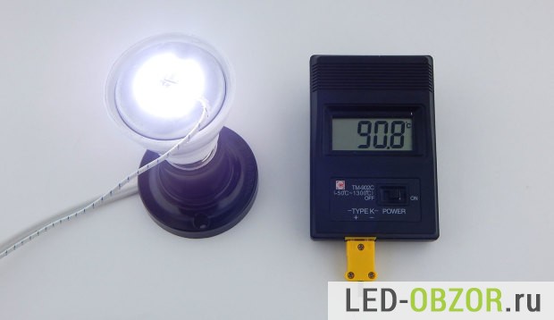 Результаты тестов показали, что световой поток завышен, но других недостатков не выявлено. Низкий нагрев обеспечит очень высокую надежность и длительную работу светодиодной лампы в течение 50.000 часов.