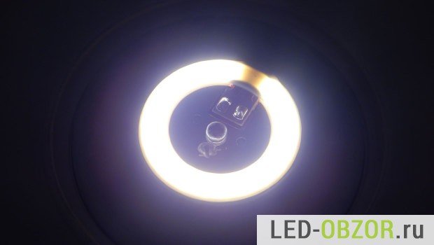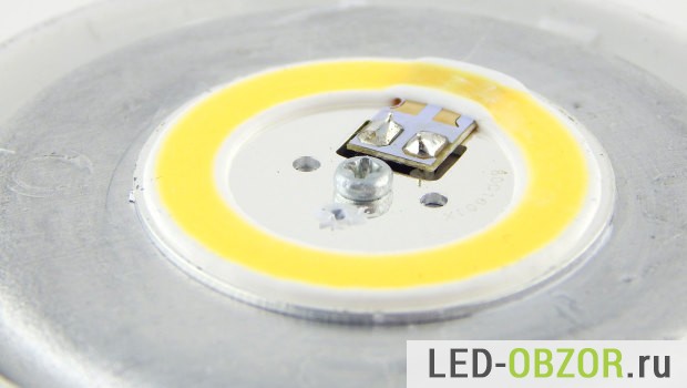 Начинка всех моделей состоит из драйвера и светодиода MCOB в виде кольца, который относится к 5 поколению. Основное отличие от обычного COB в улучшенном охлаждении led кристаллов. На каждом таком кольце расположено от 50 до 150 маломощных LED кристаллов, подключенных последовательно. Из-за этого напряжение питания такого MCOB диода достаточно высокое: