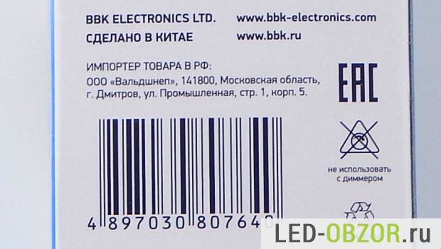 Если вас интересует диммирование освещения, то на упаковке должно быть это указано. У тестируемого образца ББК написано «не использовать с диммером».