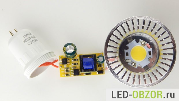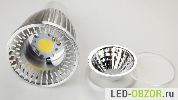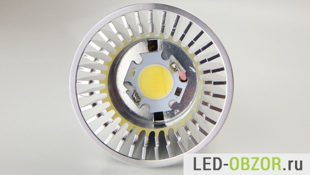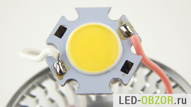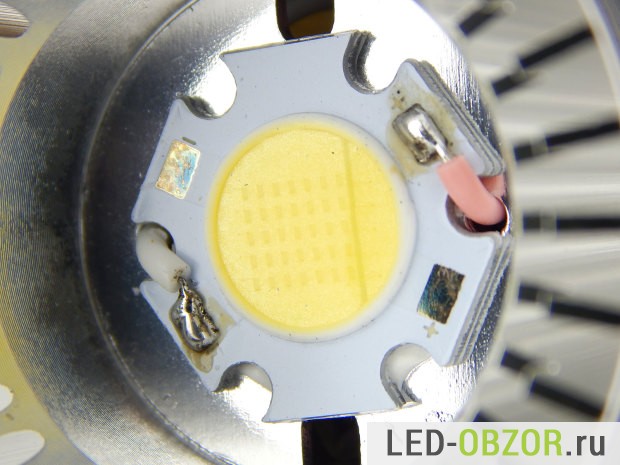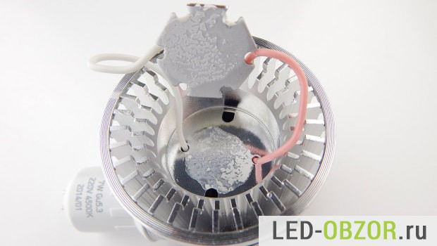 Внутри корпуса MR16 G 5.3 установлен светодиод COB на 7W, который держится на термопасте и ничем не прикручен. Теплопроводящая паста достаточно густая, чтобы держать его плотно, сначала думал, что он приклеен.