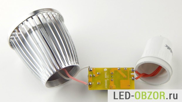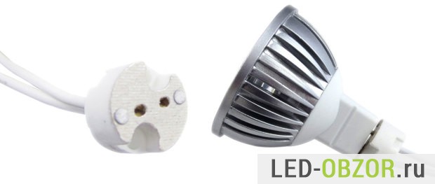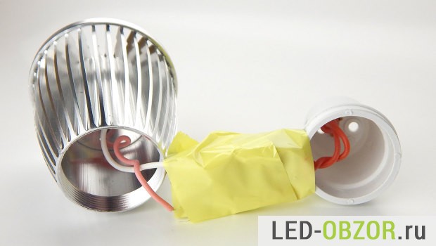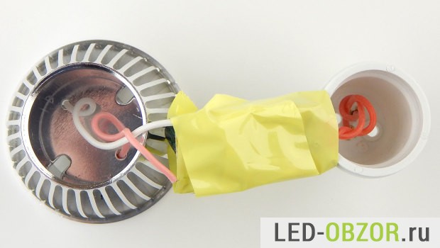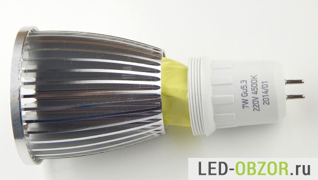 Пластмассовый цоколь GU 5.3 крепится к радиатору из алюминия посредством резьбы. Если потребуется ремонт, то ничего ломать и отклеивать не надо будет, просто выкручивается.