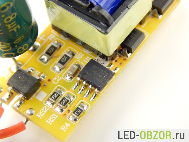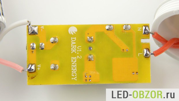 Блок питания светодиода выполнен полноценным, не облегченная версия. Для изоляции от корпуса MR16 используется высокотехнологичный желтый скотч. Только название у драйвера странное «Dark Energy» V1.2, переводится как «Темная энергия». Видимо для использования на темной стороне силы джедая.