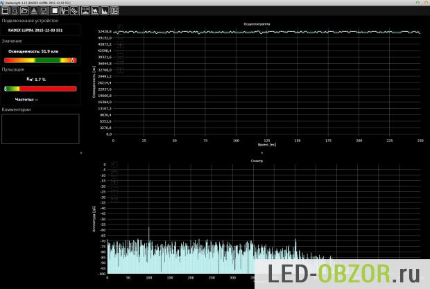 Пульсации света измеряем волшебным прибором Radex Lupin. Для примера, лампа накаливания имеет этот показатель в среднем 15%.