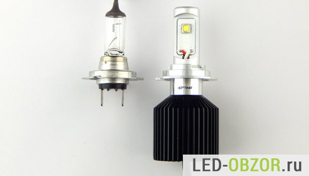 Сравнивать будем со стандартной галогенной лампой, устанавливаемой на заводах. В качестве эталона будет новая галогенка Osram H7 55W 12V. Светодиодная лампа H7 бренда Optima собрана на двух светодиодах Cree XML.