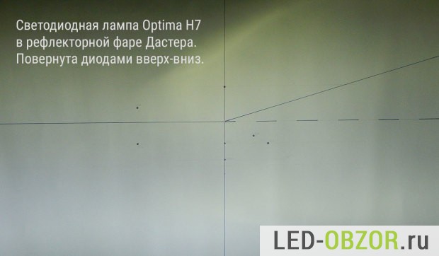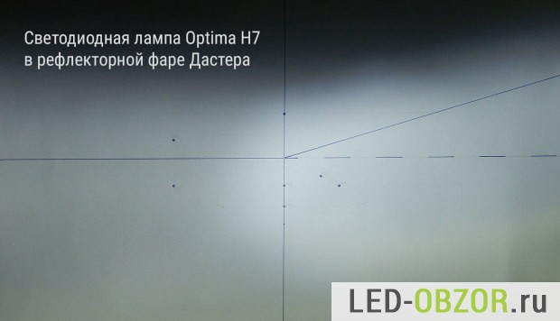 Результаты теста в фаре от Дастера наглядно показывают, что светодиодную лампочку Н7 нельзя ставить в рефлекторную оптику, с отражателем. СТГ отсутствует, и светит гораздо выше.