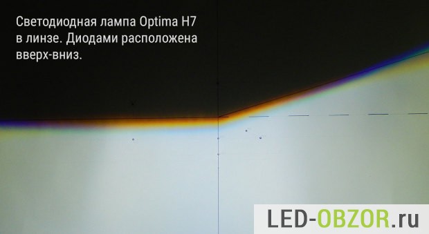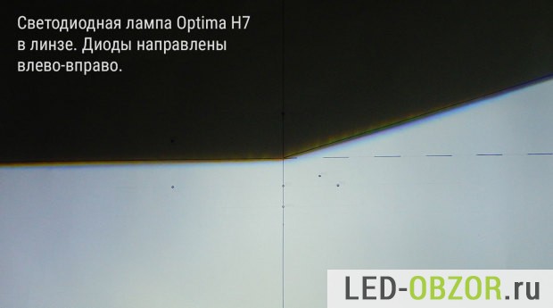 При повороте диодами вверх-вниз освещенность повышается, светит хуже галогенной в среднем на 35%. Светотеневая граница теряет четкость и превращается в радугу, переливаясь разными цветами. Это хорошо видно на фото.