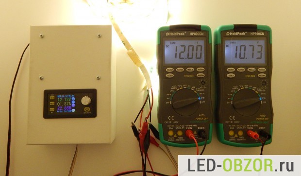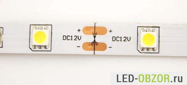 При подключении питания 12В с одного конца светодиодной ленты длиной 5 метров, на другом будет только 10,73V. Медное основание достаточно тонкое, из-за этого при токе 3-6 Ампер возрастает сопротивление. Напряжение и мощность будут равномерно снижаться к концу ленты.