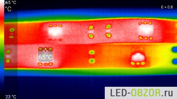 Температуру нагрева светодиодов проверяем тепловизором Thermal Seek Compact Pro. Нагрев в норме, дополнительная система охлаждения из алюминиевого профиля не требуется.