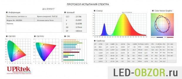 Спектрометром UPRtek MK350 проверяем индекс цветопередачи и цветовую температуру. Показатель в 3200К Кельвинов соответствует тёплому белому свету. Цветопередача очень низкая, только 59,4 CRI, хотя изготовитель обещает минимум 70CRI. Для жилых помещений такую нельзя использовать, требует от 70-90 CRI.