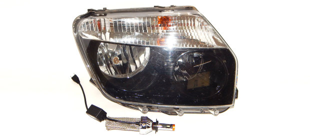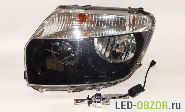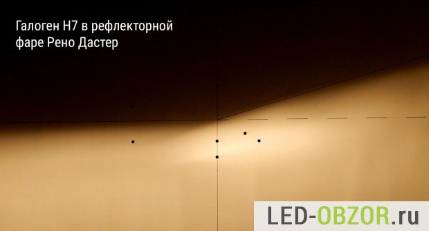 В качестве эталона будет выступать свет от галогенки, с ней и будем проводить тестирование. Для измерений используем фару от Renault Duster и линзу с цоколем H7.