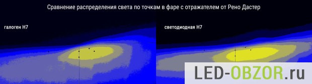 Как вы понимаете, без приличного оборудования и ничего сказать про лампочки нельзя. Но есть более продвинутые обзорщики, например Андрей Финашин, которые пытаются сравнивать различные образцы не приборе для настройки фар (реглоскопе). Но сравнивать LED, галогенные, ксеноновые источники на реглоскопе бессмысленно, потому что он измеряет освещенность только в 2 точках. Обычно одна, это осевая сила света, и вторая на оптической оси фары.