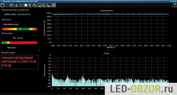 Пульсации светового соответствуют заявленным, то есть полностью отсутствуют . Прибор Radex Lupin показывает 1,5%, но учитываем погрешность самого прибора, то получается пульсаций совсем нет. Это означает, что источник питания хорошо справляется с нагрузкой и ток максимально стабилизирован.