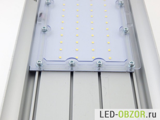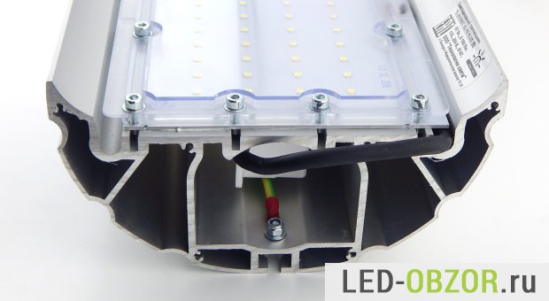 Для защиты светодиодов от воздействия внешней среды, они закрыты толстым поликарбонатным стеклом через силиконовую прокладку. Стекло прижимается при помощи 12 болтов, которые обеспечивают равномерную герметизацию без каких либо пропусков .